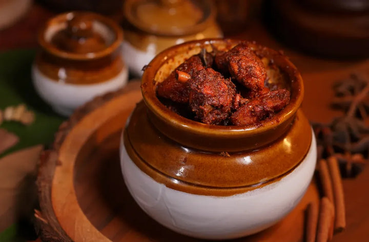 The process begins with selecting fresh, tender chicken, cleaned and marinated in rock salt, turmeric, and freshly ground masala. Then it’s fried to perfection and mixed with roasted spice powders — red chilli, coriander, mustard, cumin, fenugreek — all hand-pounded for authentic texture. Finally, it’s slow-cooked and preserved in cold-pressed gingelly oil, locking in taste, aroma, and longevity.