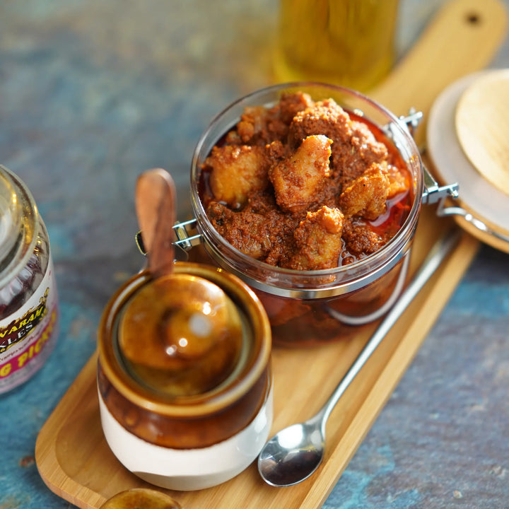 Each batch begins with farm-fresh boneless chicken, cleaned, marinated in rock salt, turmeric, and hand-pounded spice mixes. The meat is then shallow-fried and slowly simmered with freshly roasted powders — red chilli, mustard, coriander, cumin, and fenugreek — all mixed with cold-pressed gingelly oil to seal in flavor and aroma.