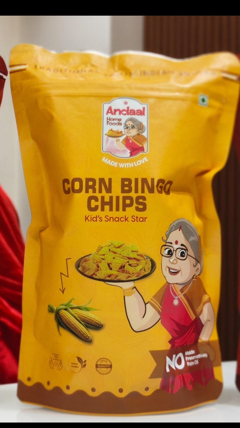 ANDAAL HOME FOODS Corn Bingo Chips are light, crunchy corn chips coated in a mild masala that kids love. Made with cold-pressed groundnut oil and prepared without maida, palm oil or preservatives, these chips are ideal for lunchboxes and parties. Corn Bingo Chips are crispy, tasty and ready-to-eat — perfect for snacks anytime.